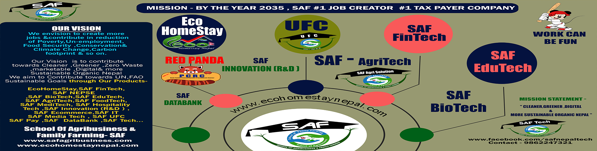 Our vision is creating jobs and contributing to the reduction of issues such as poverty,unemployment, climate change,carbon, digitalization footprint to through our products- Homestay Software,SAF Media Tech,SAF Hospitality Tech,SAF Innovation (R&D),SAF FoodTech,SAF NEPSE,SAF FinTech,SAF Hospitality Tech,SAF Biotech,SAF Edutech,SAF Agritech,SAF MediTech,SAF Ecommerce,SAFPay,SAF DataBank & SAF IT.
